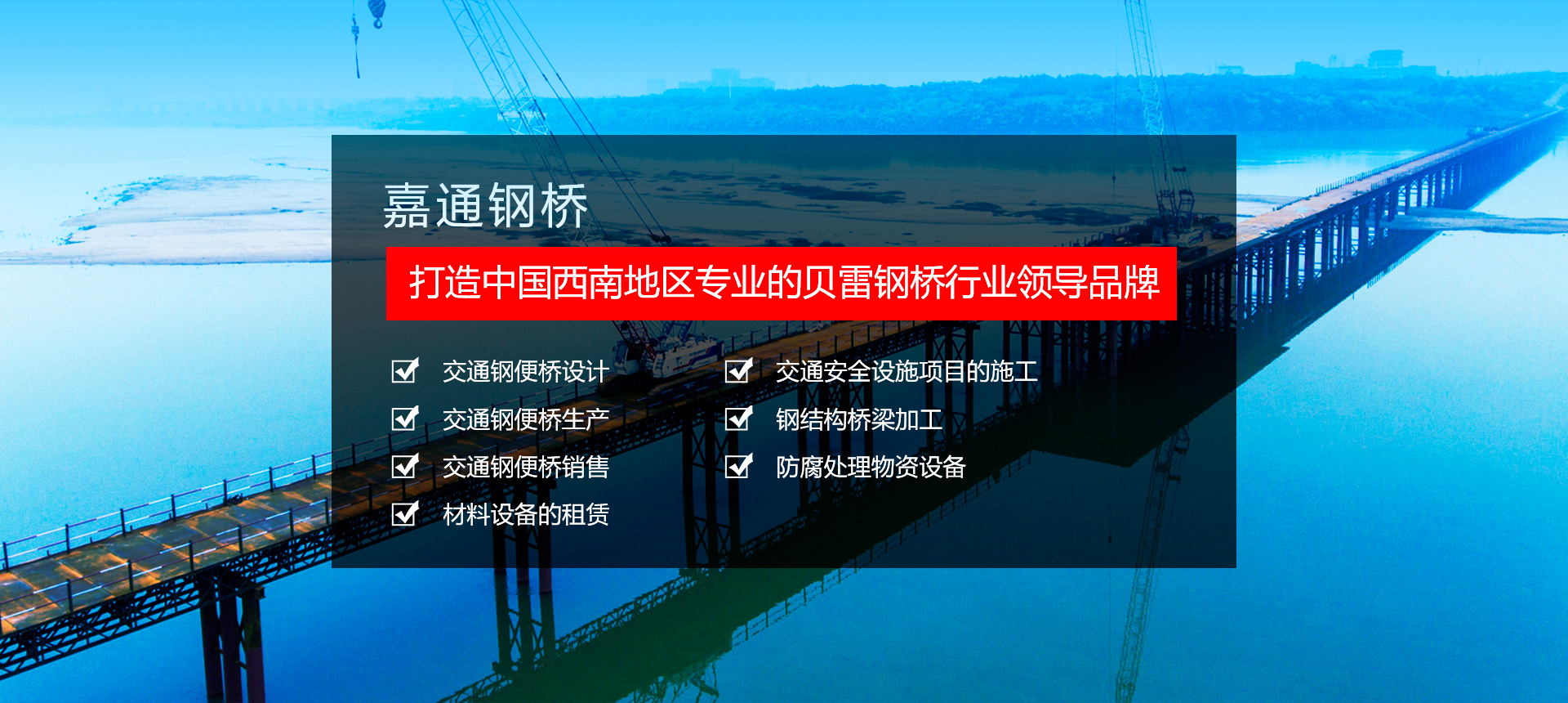 四川嘉通鋼橋工程機械設備有限公司坐落于有著天府之國的成都。以成都為中心,西南.西北和華中市場同步發展,打造中國西南地區專業的貝雷鋼橋行業領導品牌。, 主要從事: 交通鋼便橋的設計以及生產銷售 材料設備的租賃 交通安全設施項目的施工 鋼結構橋梁加工及防腐處理物資設備等業務。   公司堅持 “承諾必須兌現、要約必須履行”的誠信態度, “質量第一、客戶至上”的經營理念, 把領先的技術、卓越的管理和完全以客戶為中心的服務融為一體,為您提供優質的產品和完善的服務。